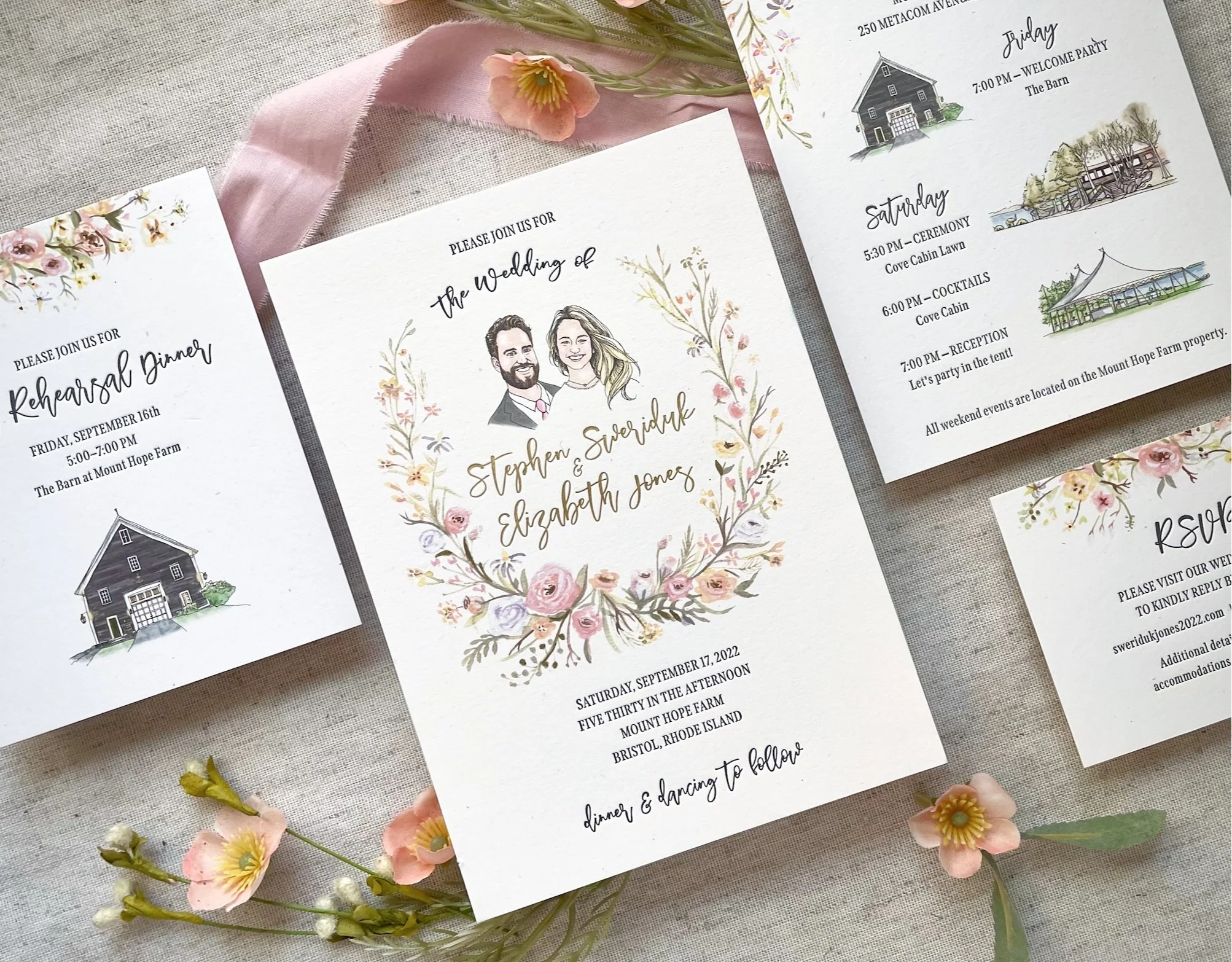 Personal touches Venue illustrations, nods to the destination, and personal imagery make the design yours.